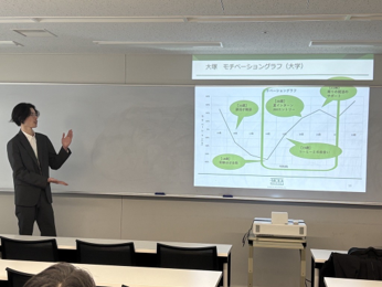 スライドを用い、個人の人生における役割の変化を捉える「ライフキャリアレインボー」と、偶然の出来事を前向きに活かす「プランド・ハップンスタンス」といったキャリア理論を紹介。自身の高校時代から大学生活、就職活動から現在に至るまでのモチベーションの変化を可視化したグラフを提示し、選択の背景や意思決定のプロセスを解説。先行きが不透明な時代だからこそ、環境に流されるのではなく、自らの価値観と経験をもとにキャリアを主体的に「デザインする」ことの重要性を後輩たちに伝えました。