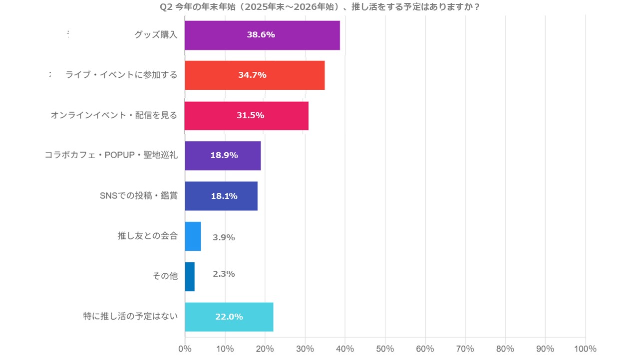 物価高や円安といった経済的な逆風が続く中でも、年末年始という可処分時間が増える時期には、推し活が優先的に選ばれていることも示しており、推し活は「削られやすい娯楽」ではなく、心理的優先度の高い支出・行動であることが明らかになりました。