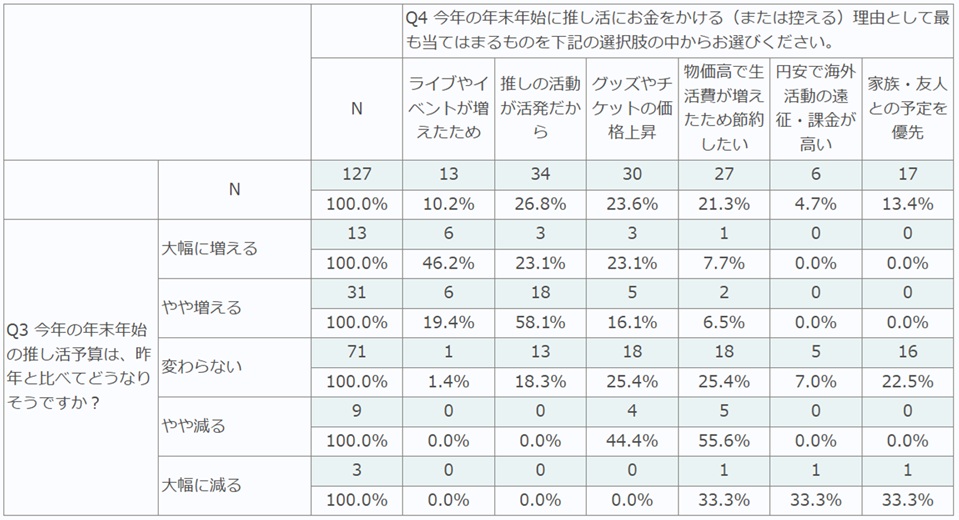 一方、「やや減る」「大幅に減る」層では、「物価高で生活費が増えた」(50.0%)「グッズ・チケットの価格上昇」(33.3%)に回答が集中。”推しへの気持ちは変わらないが、家計を優先せざるを得ない”という社会人ならではの事情も推察されます。