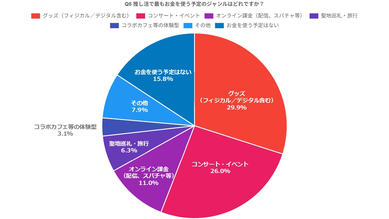 予定の内訳では「グッズ購入」(38.6%)が最多で、「ライブ・イベントに参加する」(34.7%)、「オンラインイベント・配信を見る」(31.5%)と続きました。