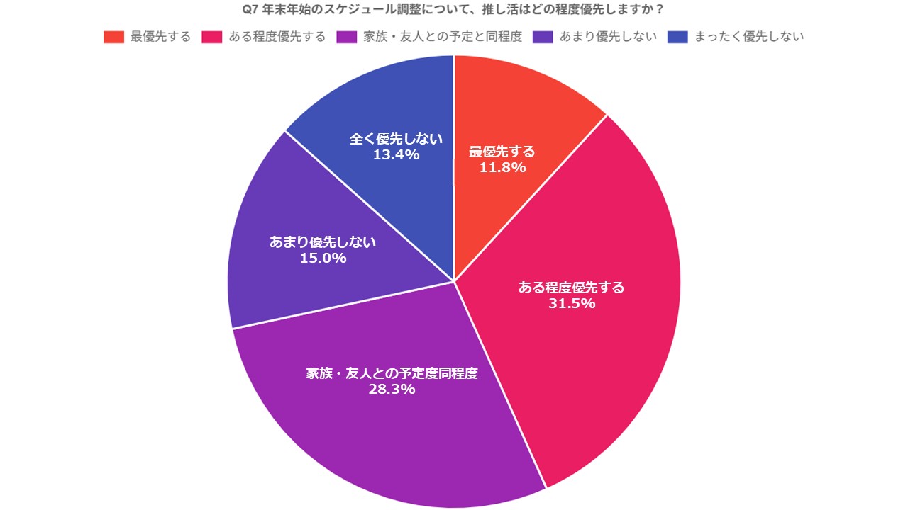 「年末年始のスケジュール調整」については、推し活を「最優先する」(11.8%)、「ある程度優先する」(31.5%)との回答がある一方、それ以外の回答をした人も一定数見られました。帰省や親族行事、旧友との再会など、年末年始特有の予定が推し活の優先度にも影響していることが分かります。