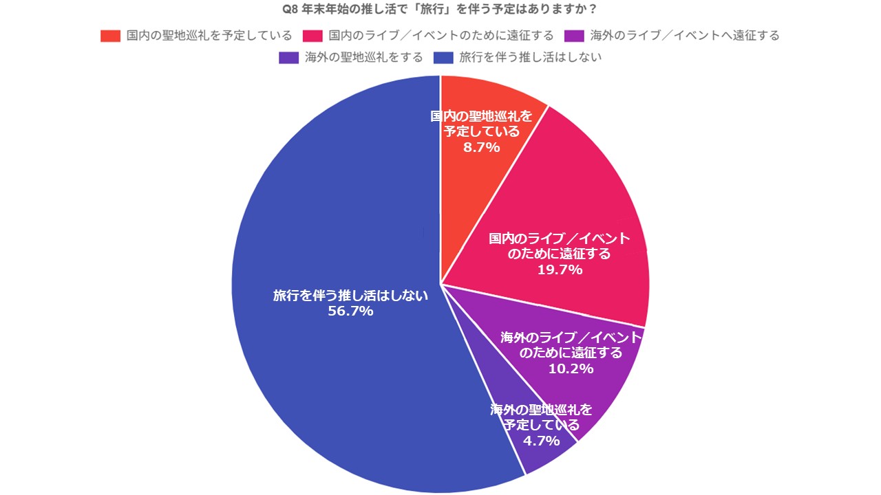 「年末年始の推し活で「旅行」を伴う予定」を聞いたところ、「旅行を伴う予定はない」との回答が56.7%で最多。「ある」と答えた人の予定は「国内のライブ/イベントのために遠征する」(19.7%)、「海外のライブ/イベントへ遠征する」(10.2%)が上位となりました。