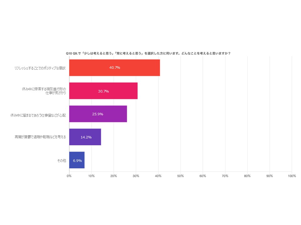 その内容としては、「リフレッシュによる前向きな意欲」(40.7%)が最多である一方、「仕事の停滞が気がかり」(30.7%)、「休み明けの業務量が不安」(25.9%)といったストレス要因も多く挙げられています。