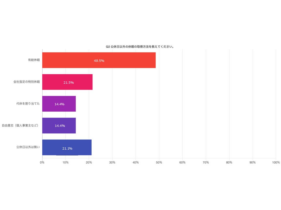 公休日以外の休暇取得方法では、「有給休暇」が48.5%で最多となり、依然として個人の裁量に依存している実態が見られます。